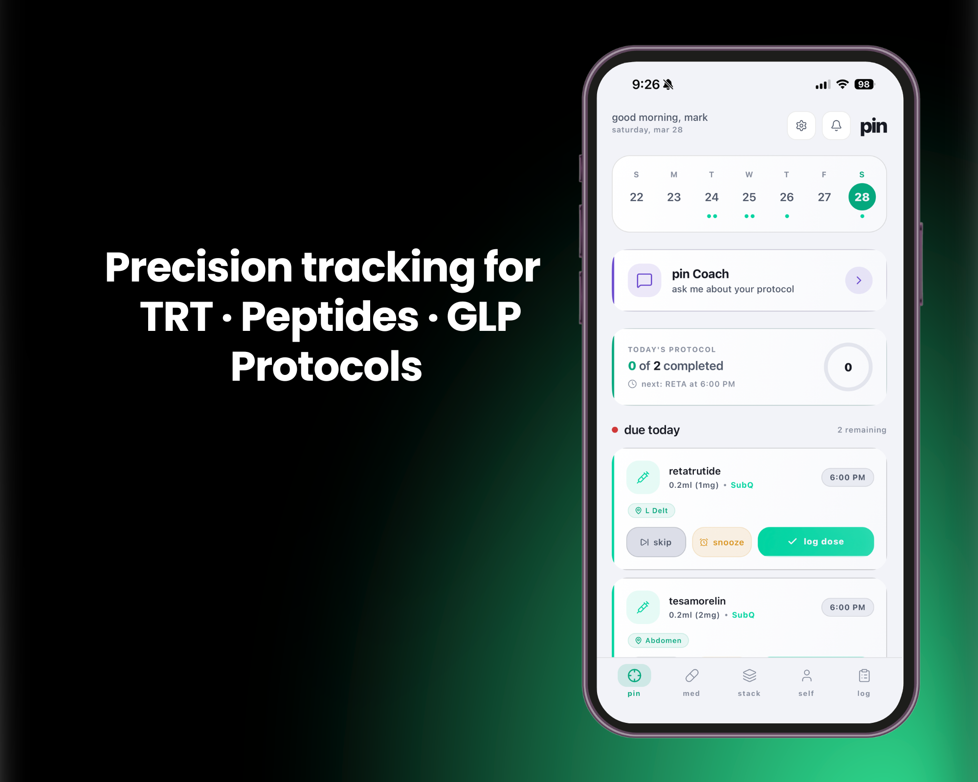 pin is a structured tracking app designed to help you log, manage, and review your TRT, peptide, GLP, and HRT routines with clarity and consistency.